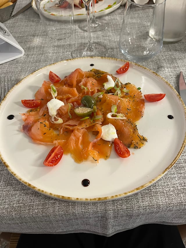 - Carpaccio di trota su letto di valeriana al pepe rosa e crostini