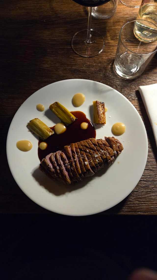 Petto d’anatra rosato al burro e aromi, con porro al cartoccio al miele e soia, servito su purea di mela verde al timo.
