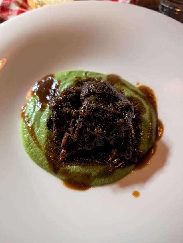 Spalla di vitello brasata al vino rosso con verdure, servita con purea di piselli al cardamomo e piselli freschi glassati nel fondo di cottura.