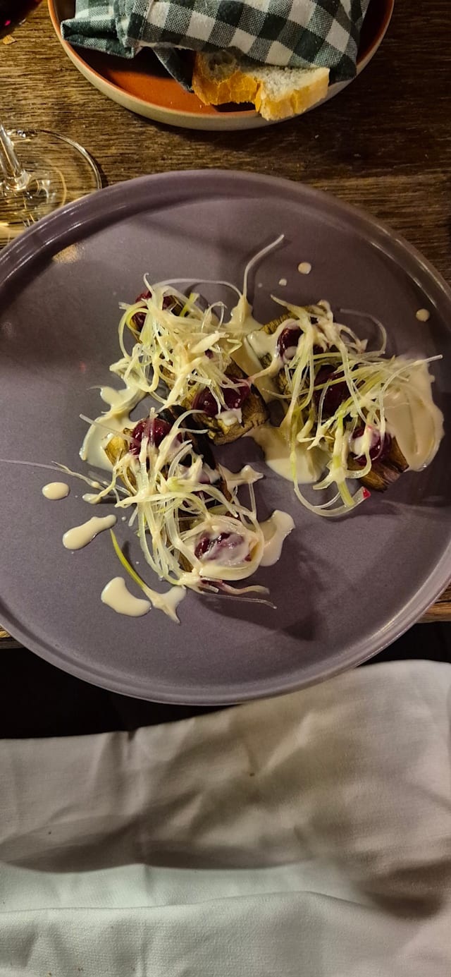 Melanzana arrostita condita con olio e sale, servita con ketchup di rapa rossa (rape, aceti, sciroppo d’acero, miele, pomodoro), salsa di arachidi e latte di soia, completata da sedano julienne.