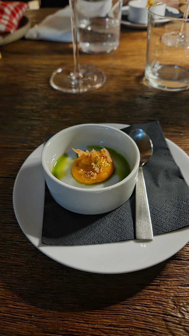 Emulsione di sedano, cerfoglio, prezzemolo, basilico e zucchine, con peperone verde, limone e tabasco, servita con ricotta e puccia di Cortina croccante.