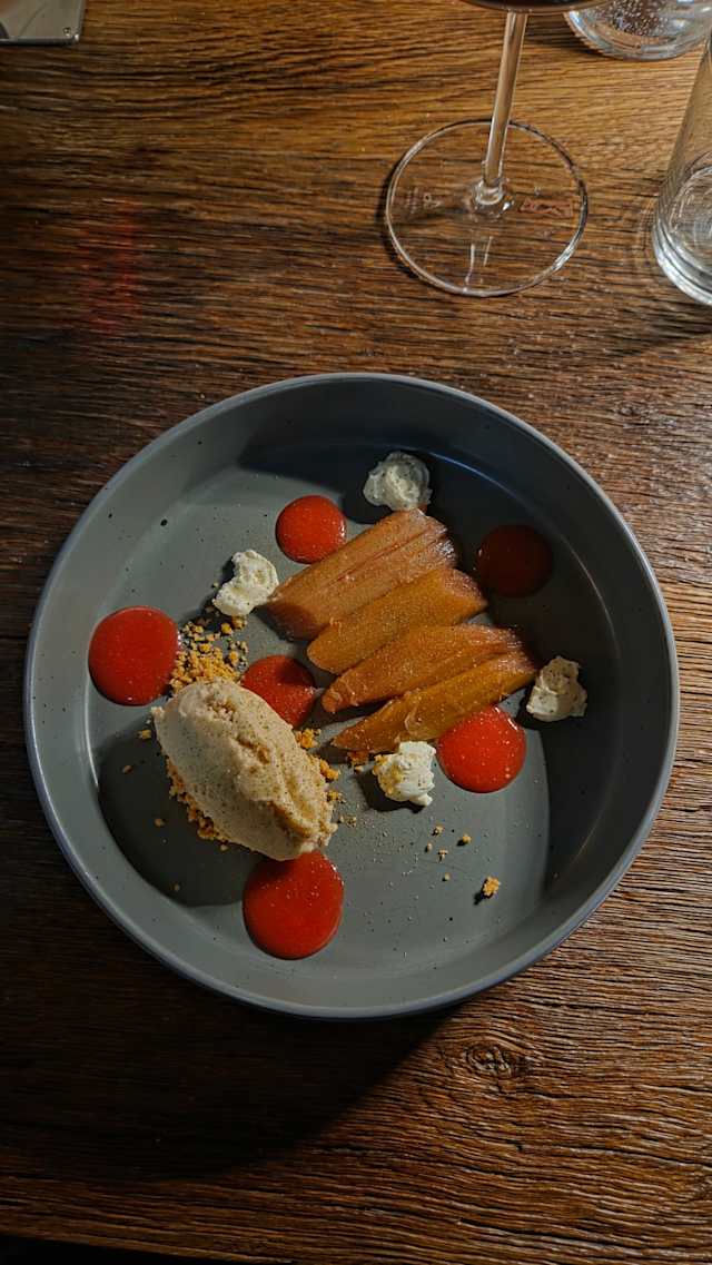 Rabarbaro al ribes con salsa acidula, crumble al cioccolato bianco, gelato alla nocciola e sifonata al latte all’alloro.