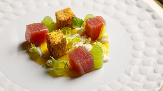 Ricciola e guanciale, fagioli di controne e dragoncello