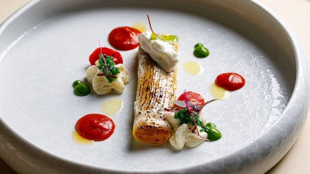 Raviolo caprese, triglia scottata e salsa kimchi