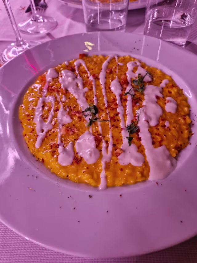 - Risotto allo zafferano, fonduta di castelmagno, fichi al forno, speck croccante