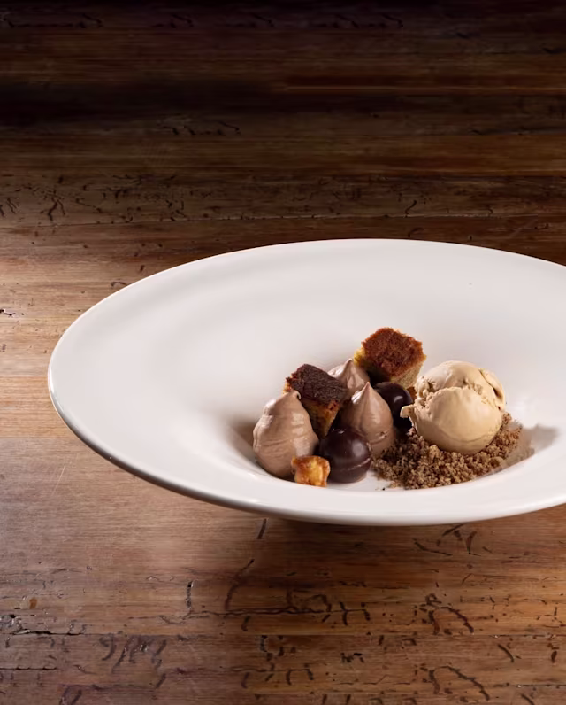 - Cremoso al gianduia, cake alla nocciola, crumble, nocciole caramellate e gelato di nocciola