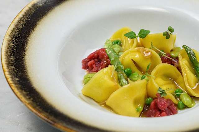- Tortelli cacio e pepe, vignarola e tartare di agnello