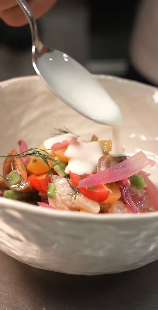 - Tataki di ricciola, taccole, agrumi salsa bernese e fondo bruno di mare