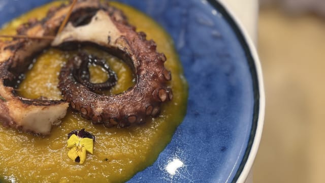 Polpa alla brace con patate, olive di gaeta, pomodorini, cipolla di tropea e basilico