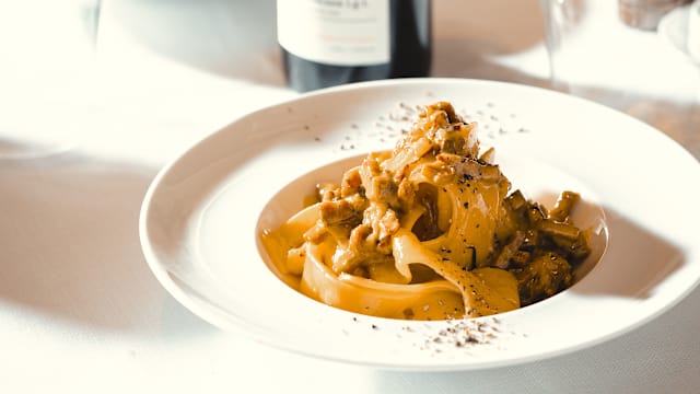 Hand rolled pici, duck confit ragù, cured eggyolk