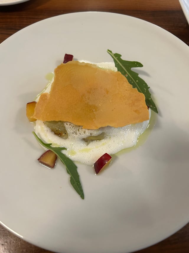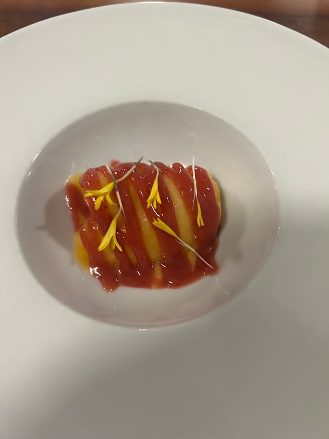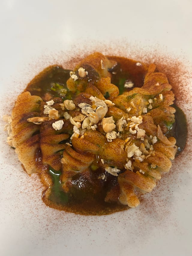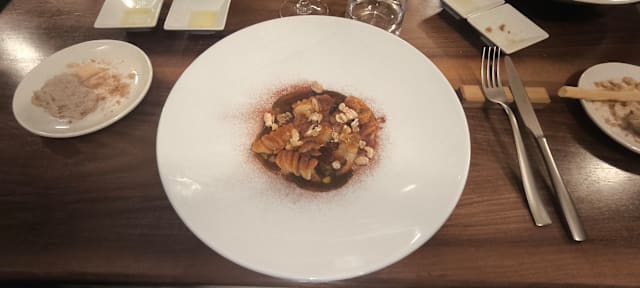 Tortello ripieno di costine brasate al vino rosso di né (tenuta ronci di nepi, vt) rucola e mela annurca