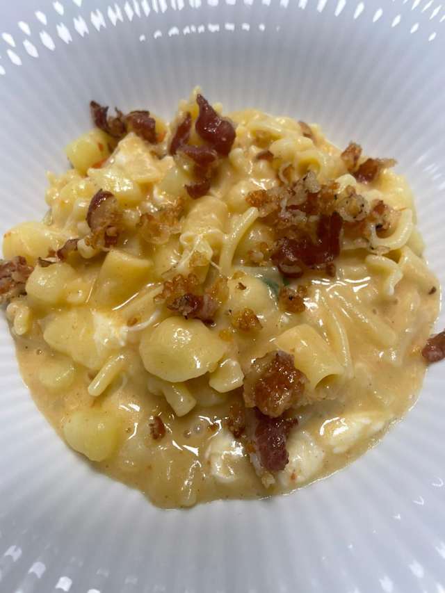 - Gnochetto di patate con crema di zucca, stracciata di bufala, guanciale croccante