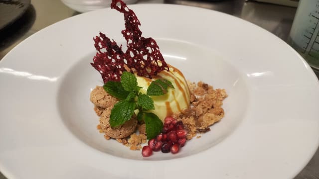 - Tarte alle nocciole, salsa al cioccolato e gelato alla nocciola