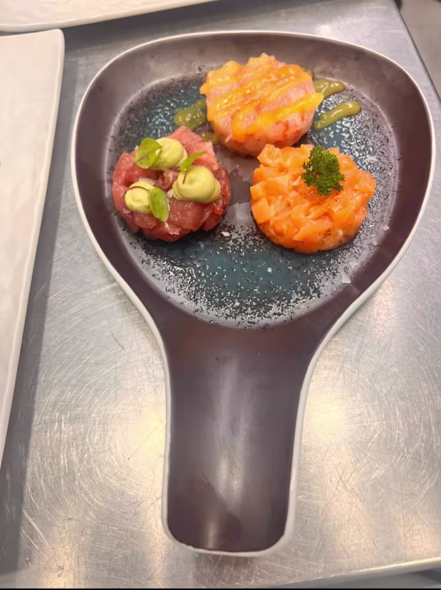 - Selezione di gambero rosso di mazara del vallo salmone e tonno tagionale servito in tartare accompagnatoda salse di frutta esotica