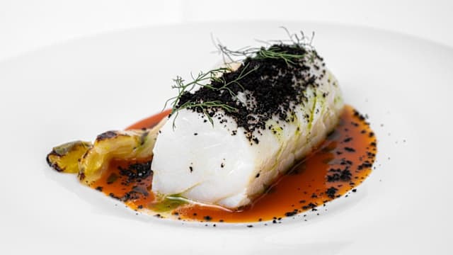 Con finocchi arrosistiti, salsa agli agrumi e salicornia