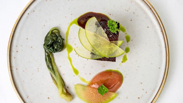 Cotto a bassa temperatura con bietola saltata, pesca e crema di verza