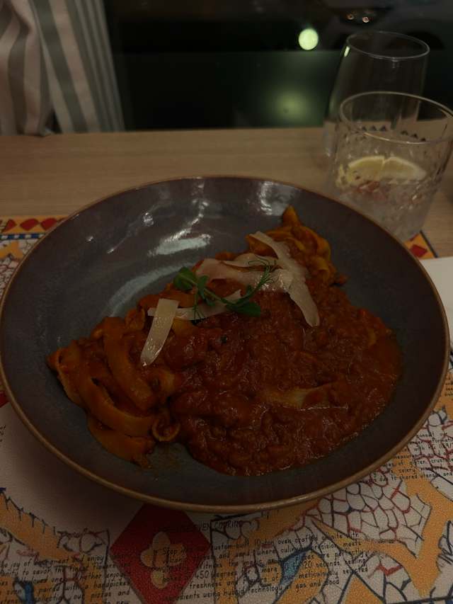 - Ragù de carne picada com molho de tomate, coberto com parmesão ralado.