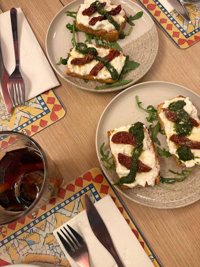 - Pão torrado com burrata fresca, tomates secos ao sol, pesto, e manjericão.