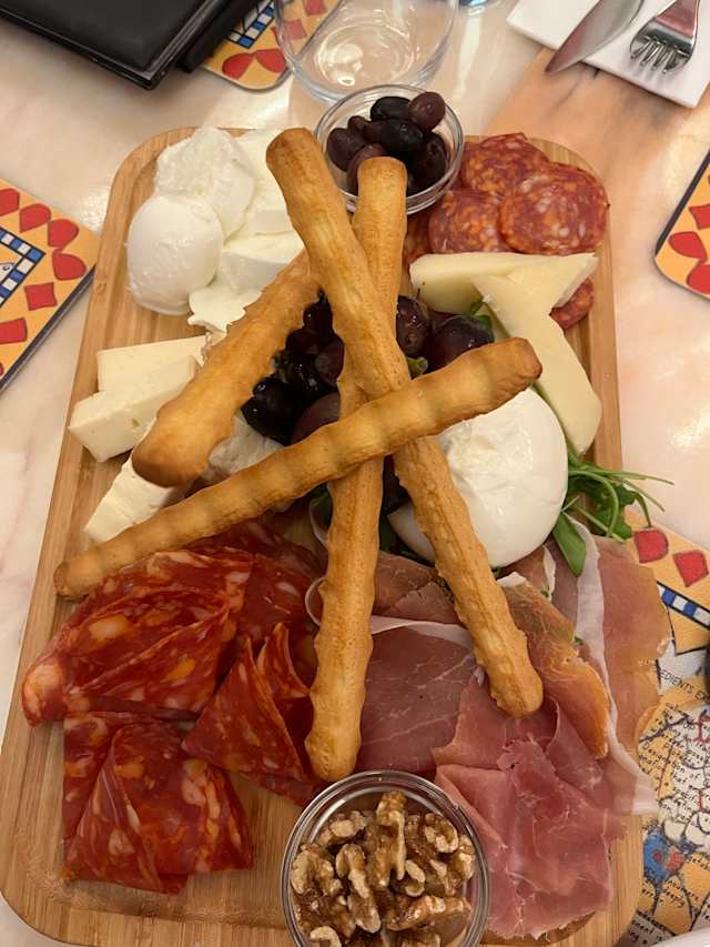 - Scamorza, taleggio, bufala, carpaccio di bresaola, presunto de parma, prosciutto, grissini, e uvas.