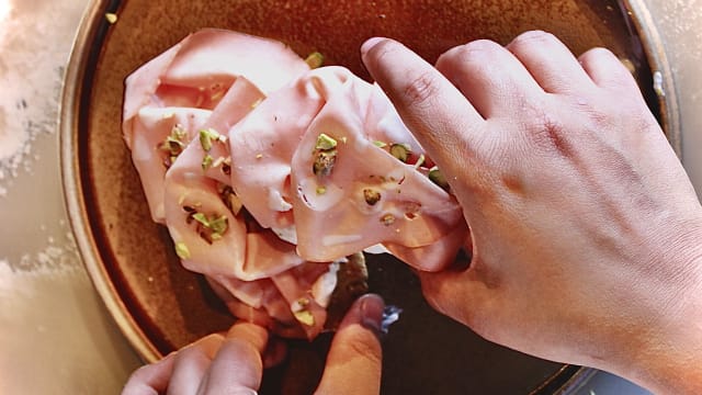 Ravioli de beterraba com ricotta, raspas de limão, manteiga de sálvia, nozes e pistáchio