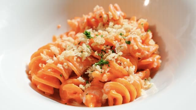 Fusillone al ragù di peperoni grigliati, fonduta di caciocavallo podolico e formaggio dei poveri