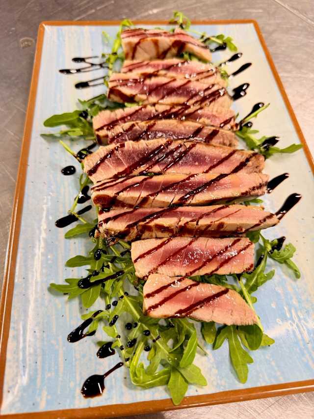 - Insalata mista, rucola, prosciutto crudo a cubetti, olive verdi, mozzarella di bufala, mandorle tostate, aceto balsamico.