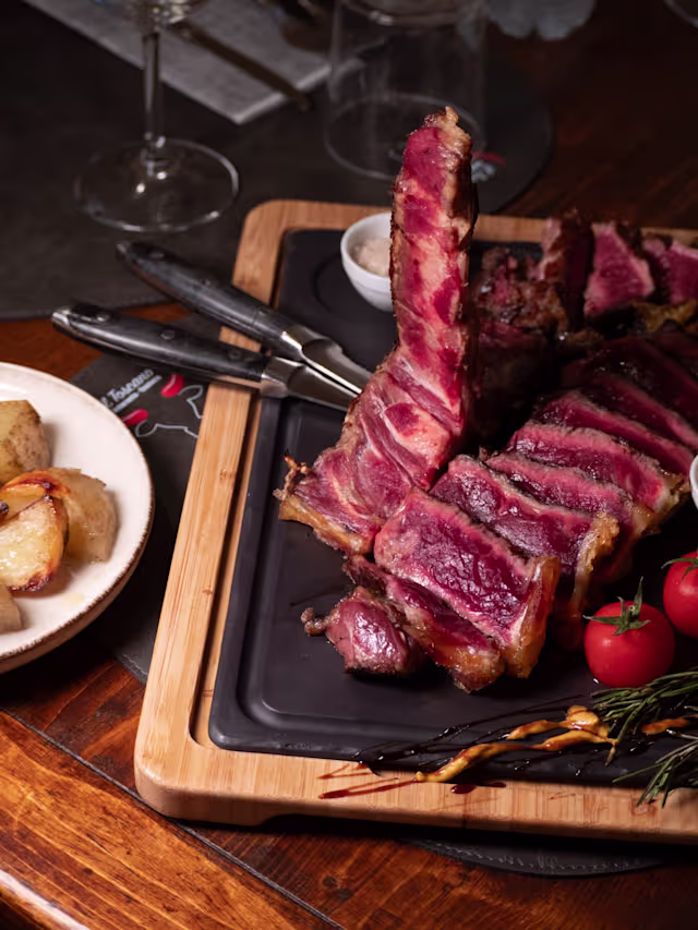 - Alla griglia, al pepe verde, alla senape, pecorino e crema di tartufo, rosmarino e sale, del toscano ( funghi porcini e pancetta), patate chips e pepe rosa, vino e aceto balsamico, cipollotti e vino rosso