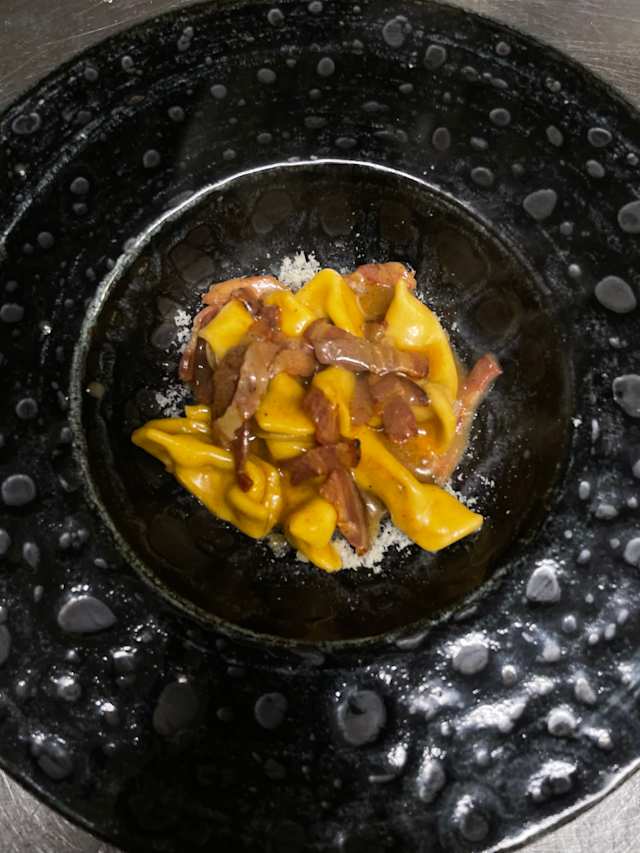 - Agnolotti al nero di seppia, fatti in casa, ripieni di branzino in guazzetto di vongole veraci e lemongrass