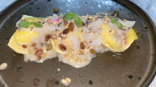 Mezzelune al limone con baccalà, pinoli e uvetta
