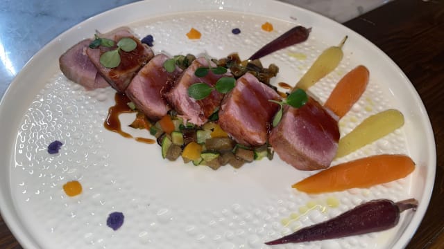 Petto d’anatra con riduzione all’arancia e cremoso di purè