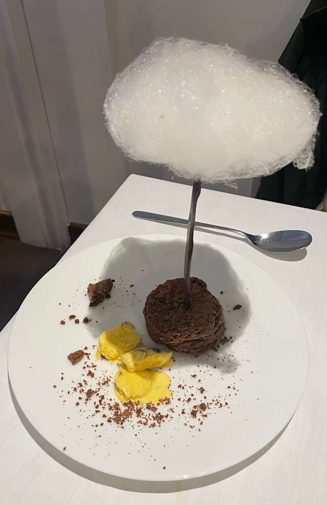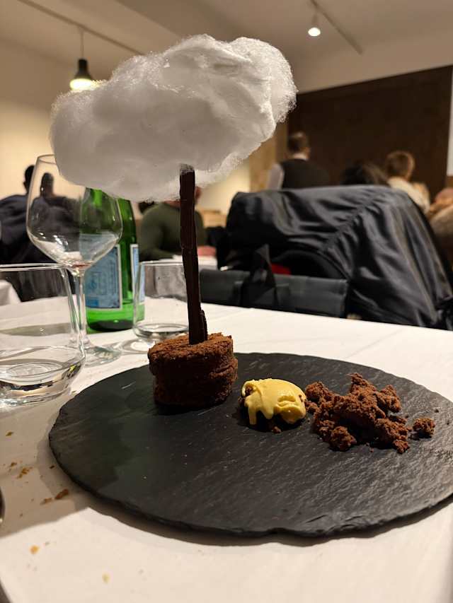 - torta al cioccolato con cioccolato fondente, semifreddo al pino mugo e zucchero filato