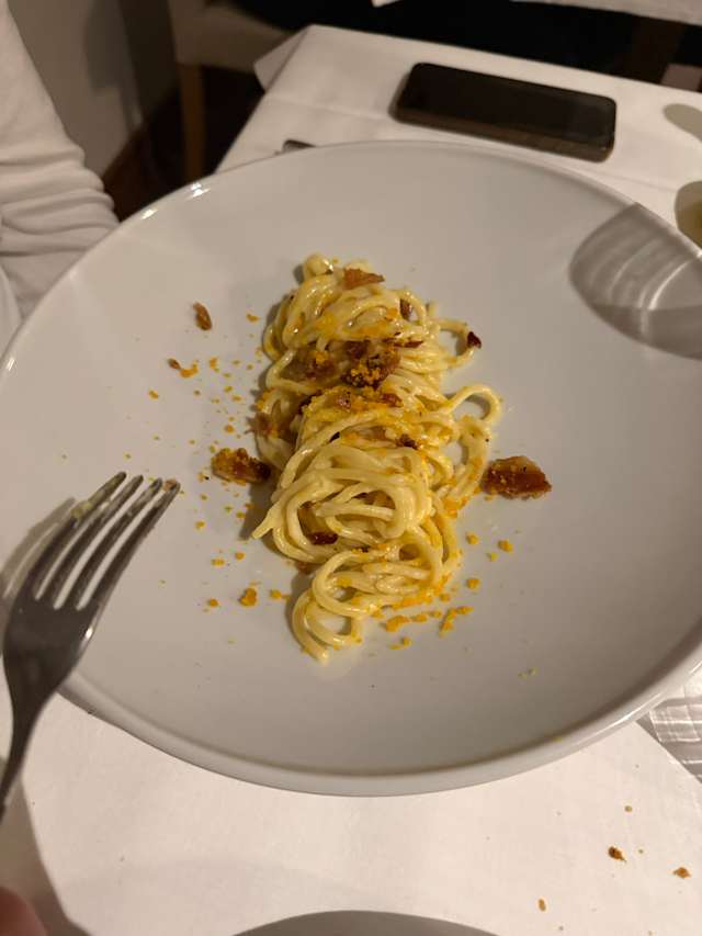 - chitarrina con uovo marinato guanciale croccante e pecorino