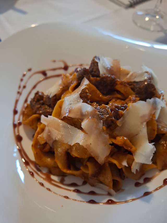 - pappardelle al ragù di cinghiale con formaggio stagionato al vino e riduzione di montepulciano