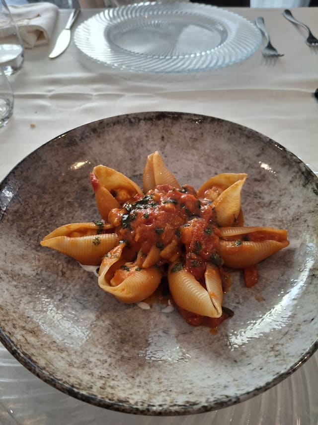 Conchiglioni con bocconcini di rana pescatrice stracciata di bufala e olio al basilico