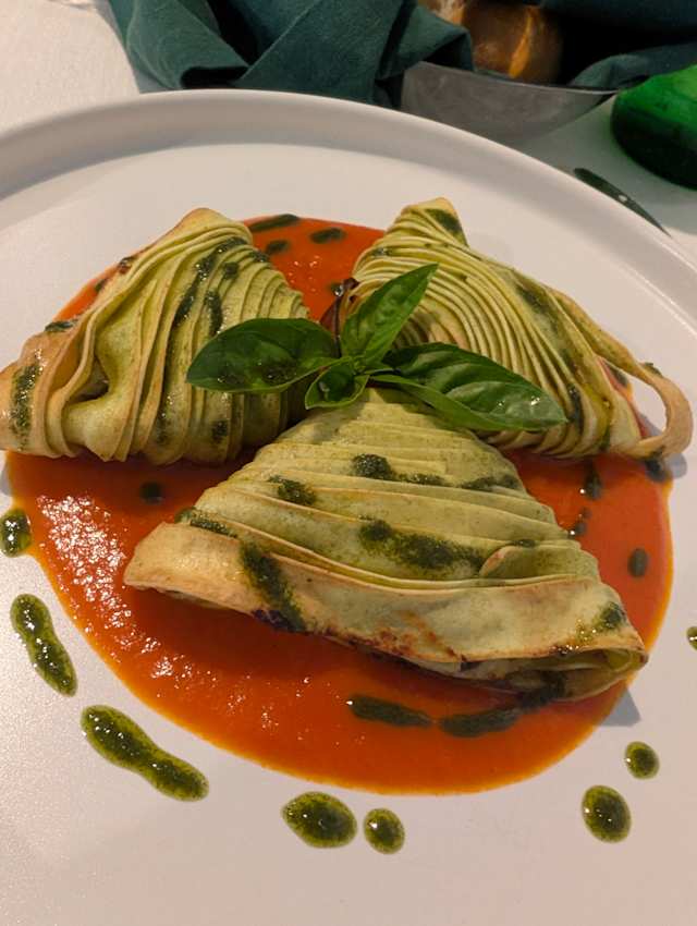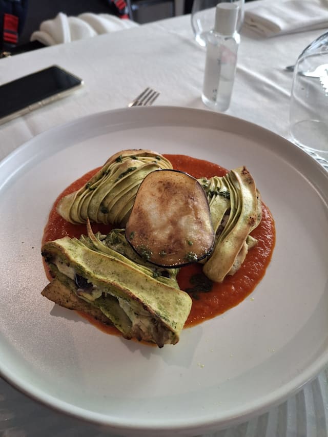 Sfogliatelle di pasta con chips di melanzane e salsa di pomodoro