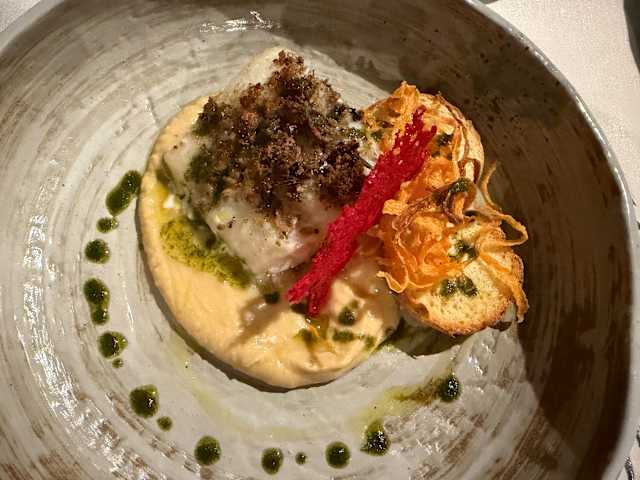 Filetto di baccalà in panura di olive e panzanella di pomodoro