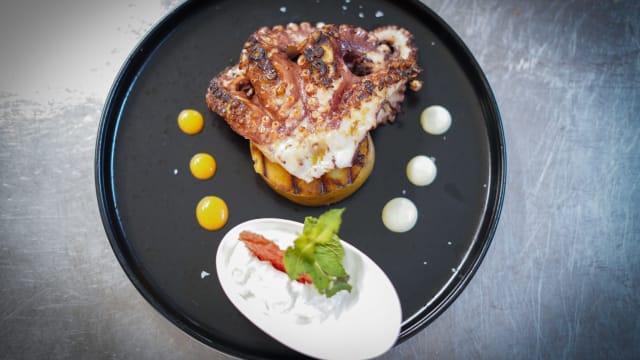 Polpo croccante con patata novella, salsa guacamole e tzatziki
