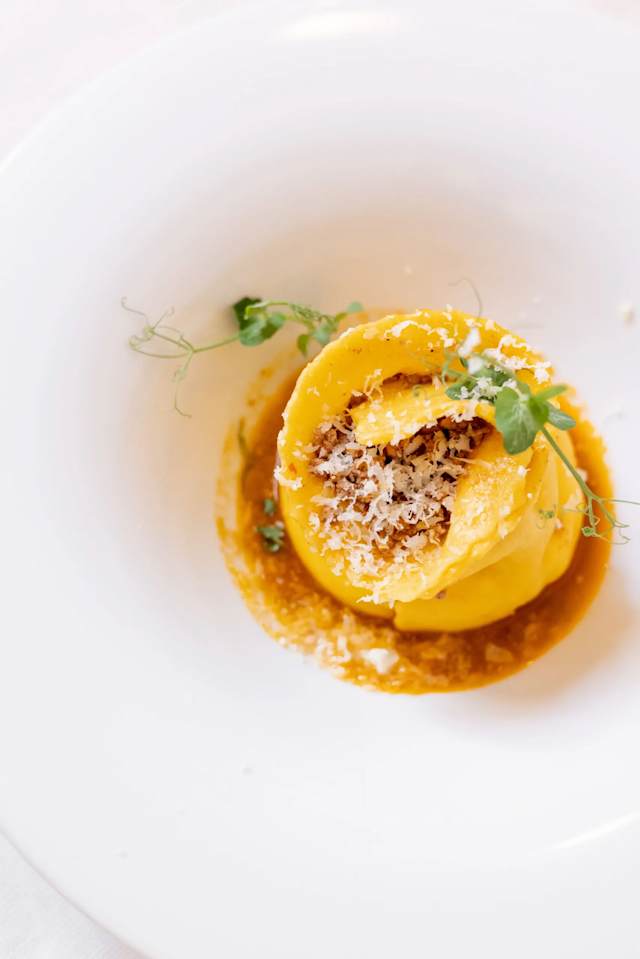 - Ravioli ripieni di parmigiano liquido e tartufo nero
