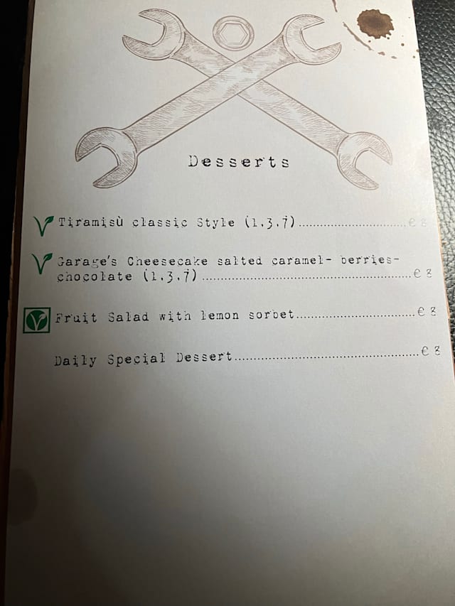 If you plan to eat at Ristorante Garage - Pizza, Grill & Cocktails, the average price should be around €29. The average price is calculated based on appetizer/entrée or entrée/dessert, excluding drinks. Prices have been provided by the restaurant.