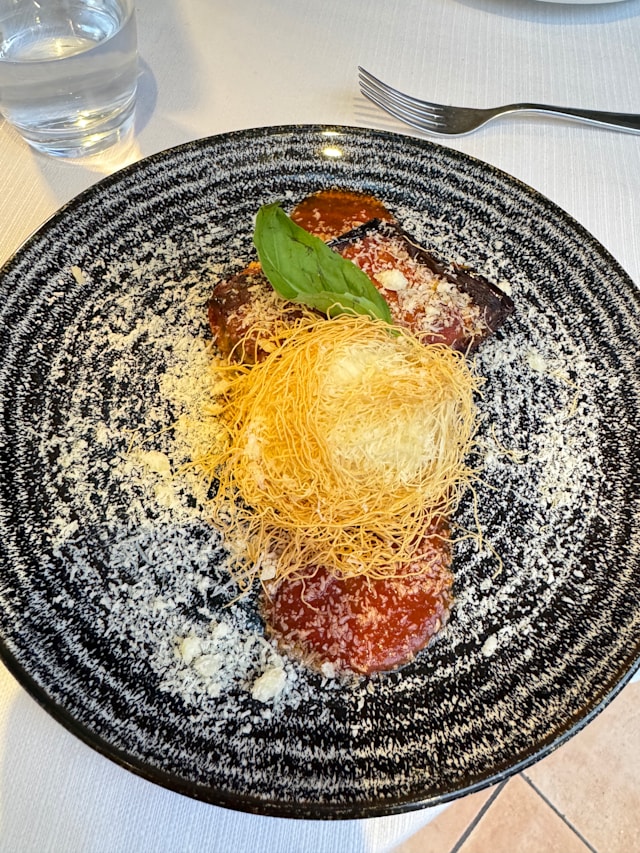 Parmigiana di melanzane con bocconcini di bufala in pesto kateifi pesto kateifi