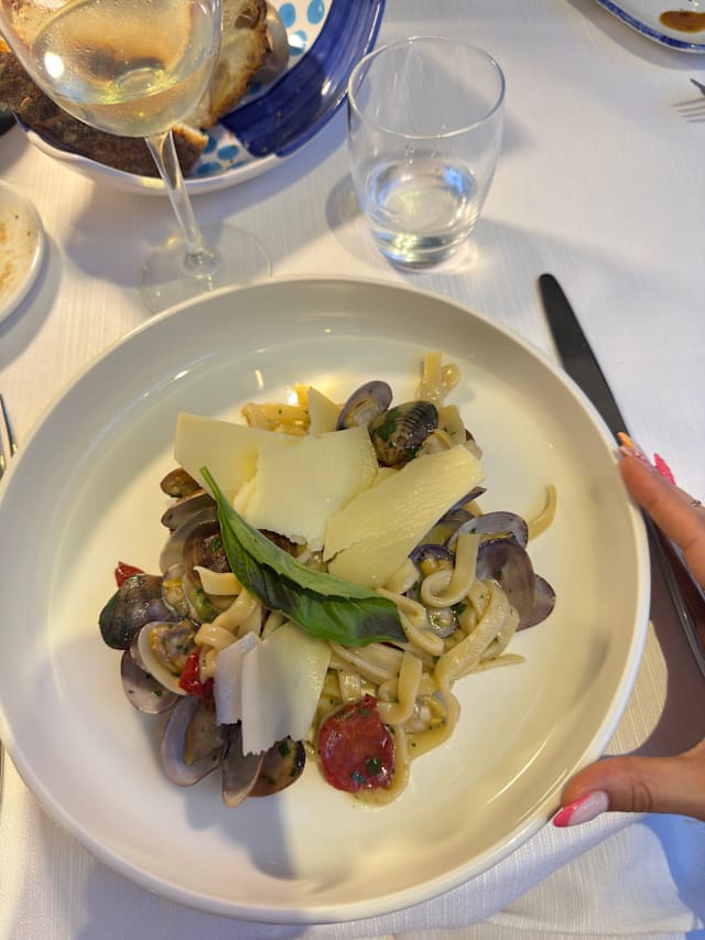 Scialatielli alle vongole, pomodori semidry, basilico e scaglie di grana