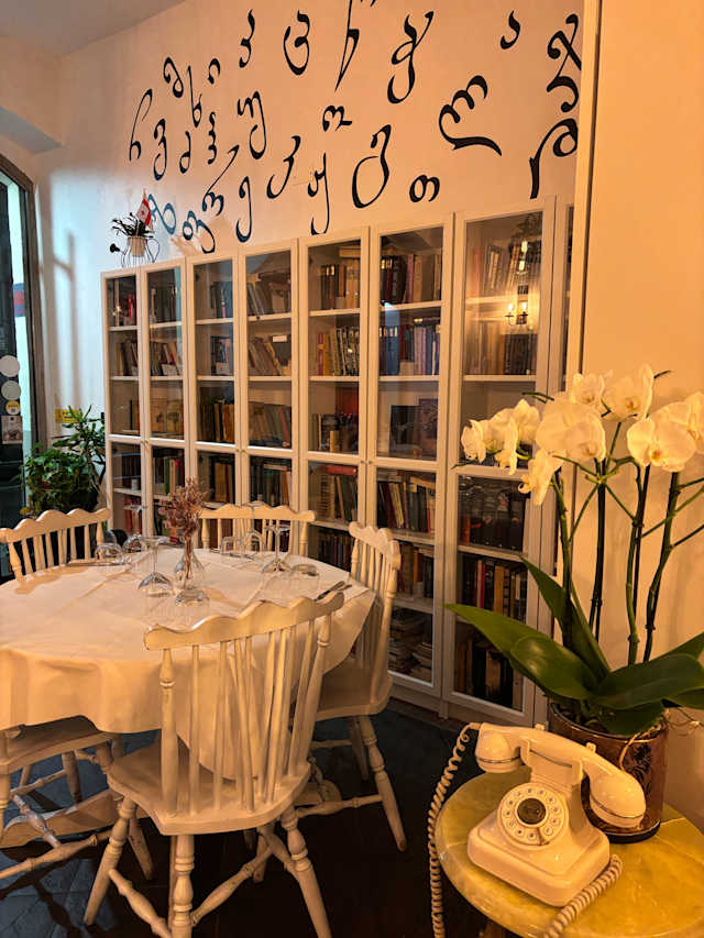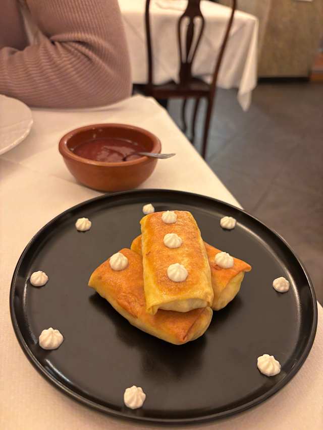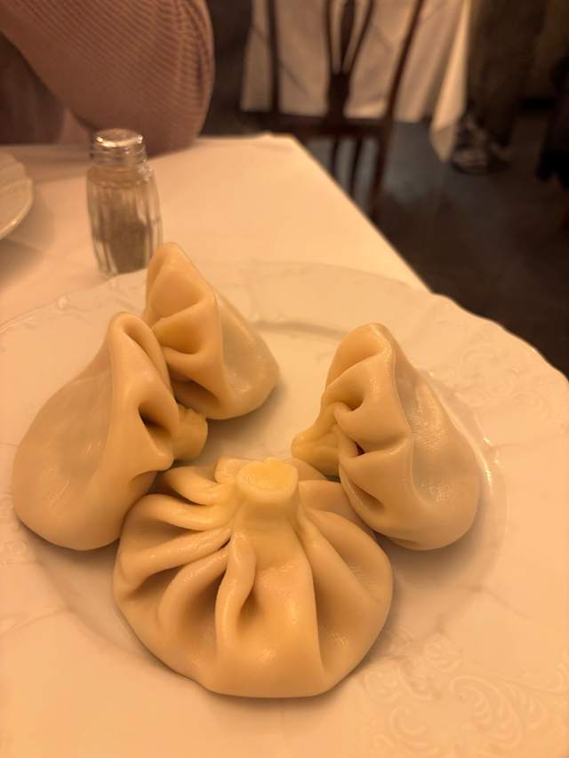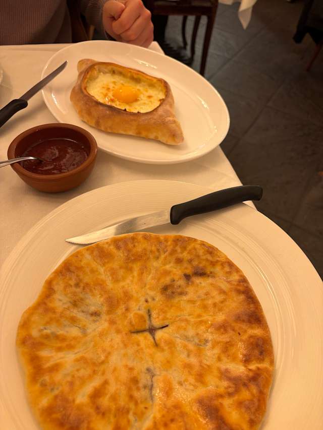 8.5/10You have to order khinkali one day before visiting!!! Leaving this comment for those who might crave it as much as I did. My bad, didn’t check menu in advance where it was written down 🥲 anyways, we took dishes to share: melanzane con salsa di noci e pane di mais (super good, especially the pane!), megluri khachiapuri (which has a good taste but visually seemed like they poured melted cheese on dough with no effort), and shkmeruli (super tasty!). We also took a bottle of Kindzmarauli - great Georgian wine. The sweets they had didn’t inspire us, so we skipped it.