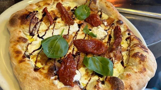 Base di ricotta gorgonzola provola taleggio fior di latte nduja granella di pistacchi basilico fresco