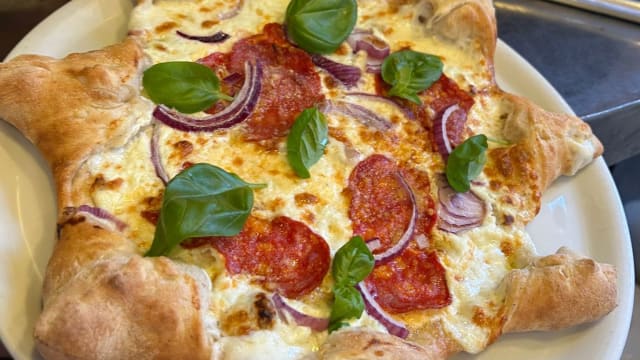 Pomodoro san marzano fior di latte gorgonzola salsiccia spianata piccante parmigiano basilico fresco