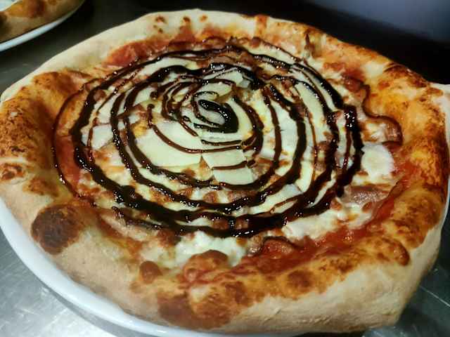 Margherita con porchetta, pecorino romano a scaglie e aceto balsamico
