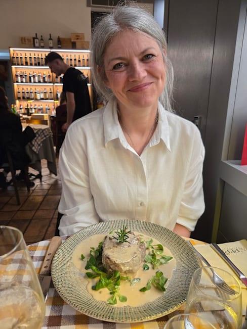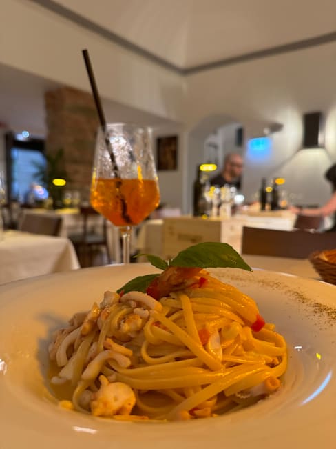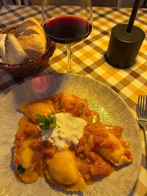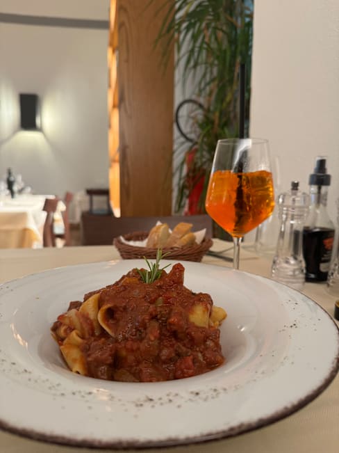 7.5/10Nice setting, conveniently located to many of the main attractions and our hotel, though not in a quieter location.. Staff was friendly and accommodating though there was an obvious mixup as our Andrey arrived. 25+ minutes after our starter was cleared. Food was generally well executed - particularly the tagliatelle ragout - (veggies w our sea bass were salty) but was disappointed that they have such a strong (if pricey) selection of bottled wines with only a handful of unnamed wines by the glass. Took a sip of a Chianti served at room temperature and had to send it back. Disappointing on our last night, would like to see them offer some by-the-glass wines good enough to name as wine is a big part of our meals and Italian life in general. I typically would’ve ordered a bottle and finished it off after dinner, but we had an early morning flight home.