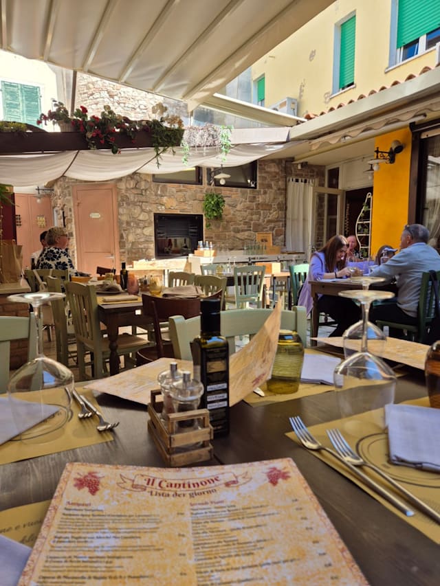6/10We visited il Cantinone on 29 Aug 22. There were 3 of us. The restaurant wasn't busy as we were quite early for Italian evening meal. Staff were all very welcoming, service was quick to find. Ordered Carbonara (v gd), Ravioli Mushroom (oily, thick pasta). Also a fusilli advertised as fresh tomatoes and basil. Came almost like canned. No fresh tomatoes and very little basil, like 3 leaves. Disappointing. The secondi had to be hurried along, but thankfully the Fritti Misto (mixed seafood) was well cooked, plentiful and fresh. Roast veg was also very good, with just enough charcoal flavour. If I hadn't had the pasta I would have been quite happy with the meal for my family. But I did. House white wasn't cold enough. Seated in a pleasant garden setting with open roof, the atmosphere was congenial. I think the staff were trying hard but lacked experience and training. They were all friendly (bar one sarcastic plate removal). Our bill was €78 which includes 'coperto' or cover charge of €6.