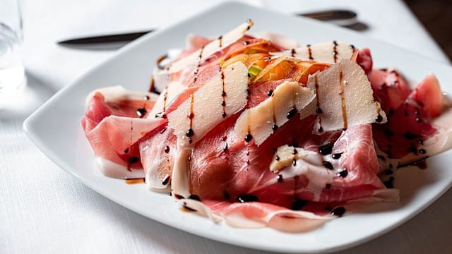 - Tagliata di manzo con rucola, parmigiano reggiano, aceto balsamico e fiocchi di sale maldon