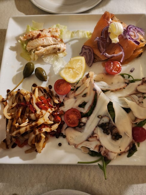 Crostacei gratinati: #2 mazzancolle, #2 scampi, #2 granchi - assaggio di fritto misto, antipasti freddi di mare [a seconda del mercato], zuppa di frutti di mare.