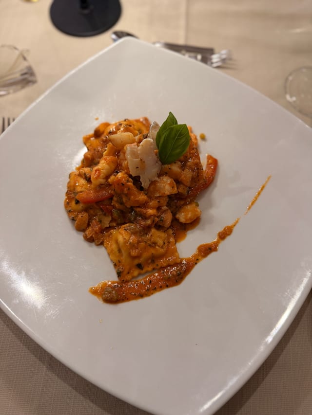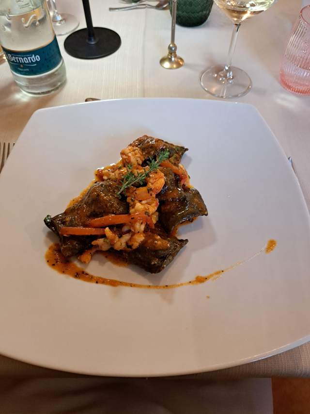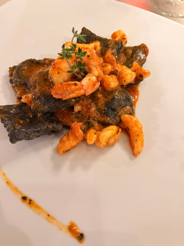 - Tortelli di grano saraceno al nero di seppia con granchio e gamberoni